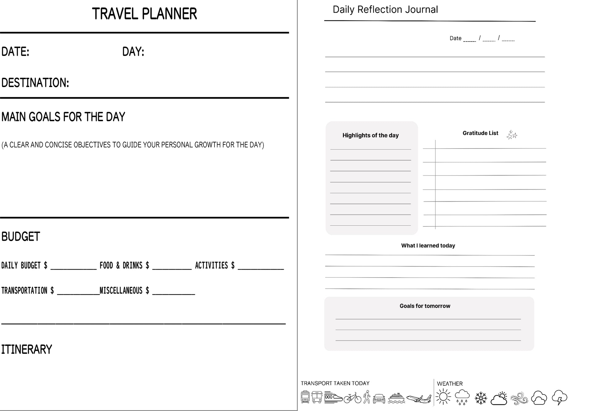 The travel journal includes: