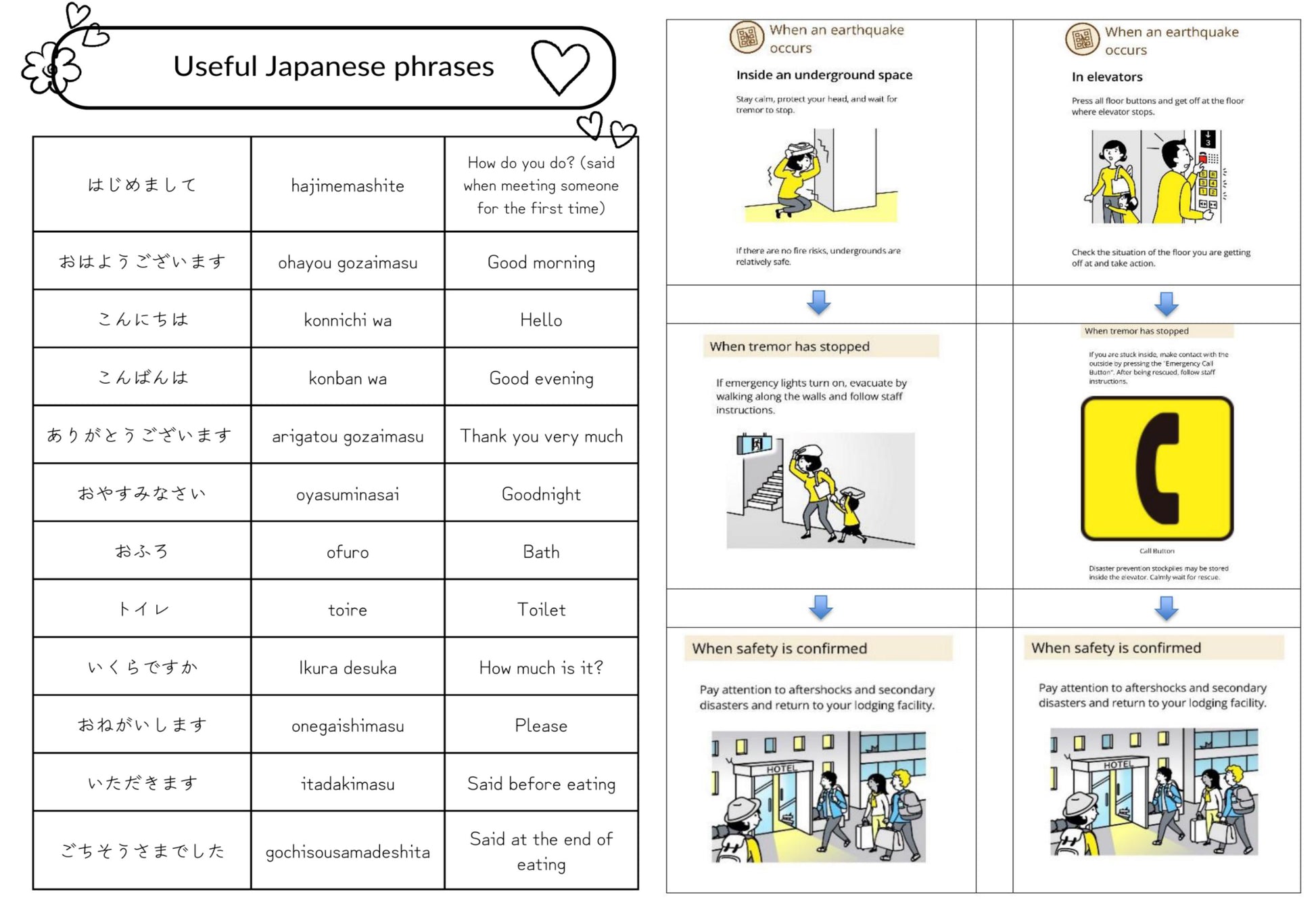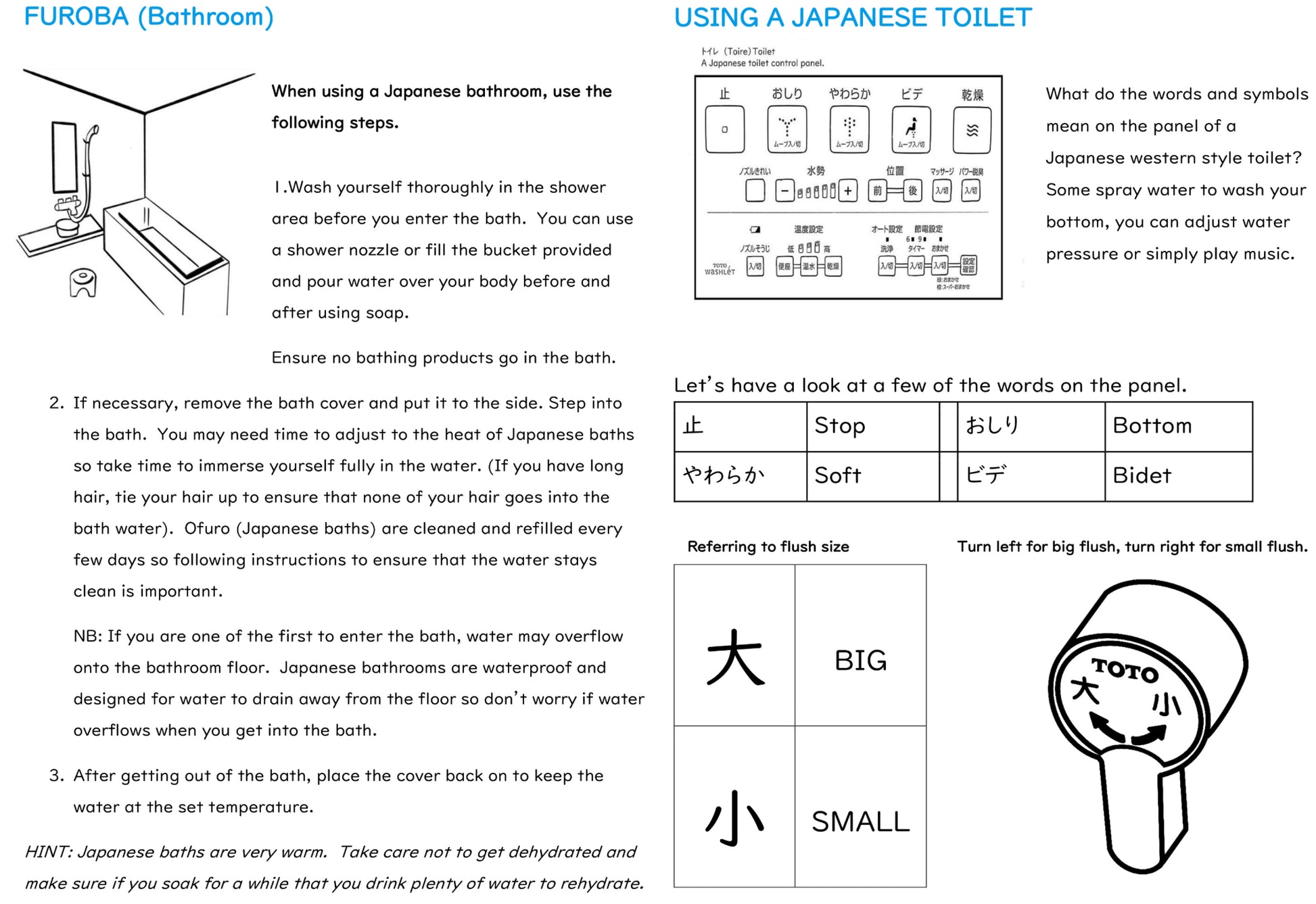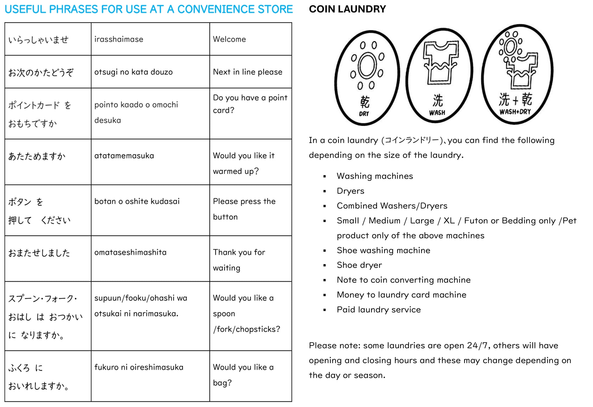 - Cultural guides (directions, transportation, recycling, Japanese style rooms, bathrooms/toilets, visiting temples and shrines, convenience stores, dining etiquette, currency, food, etc)