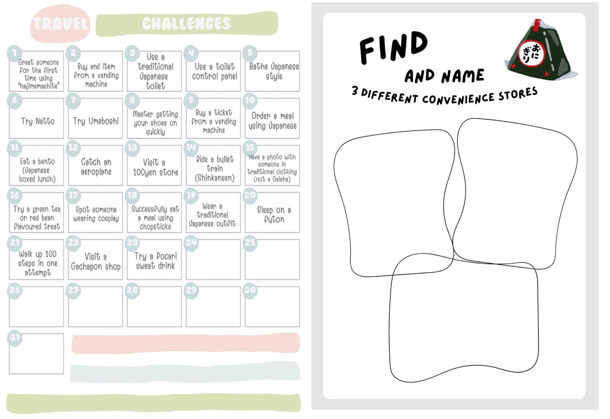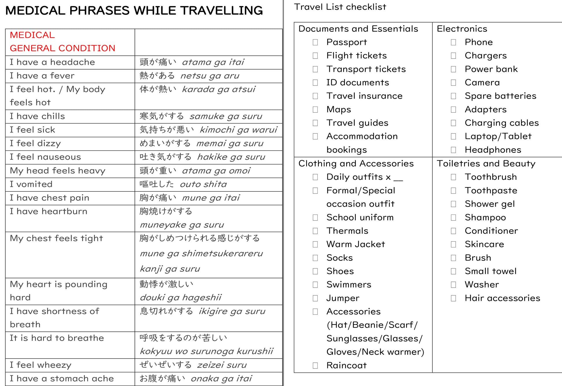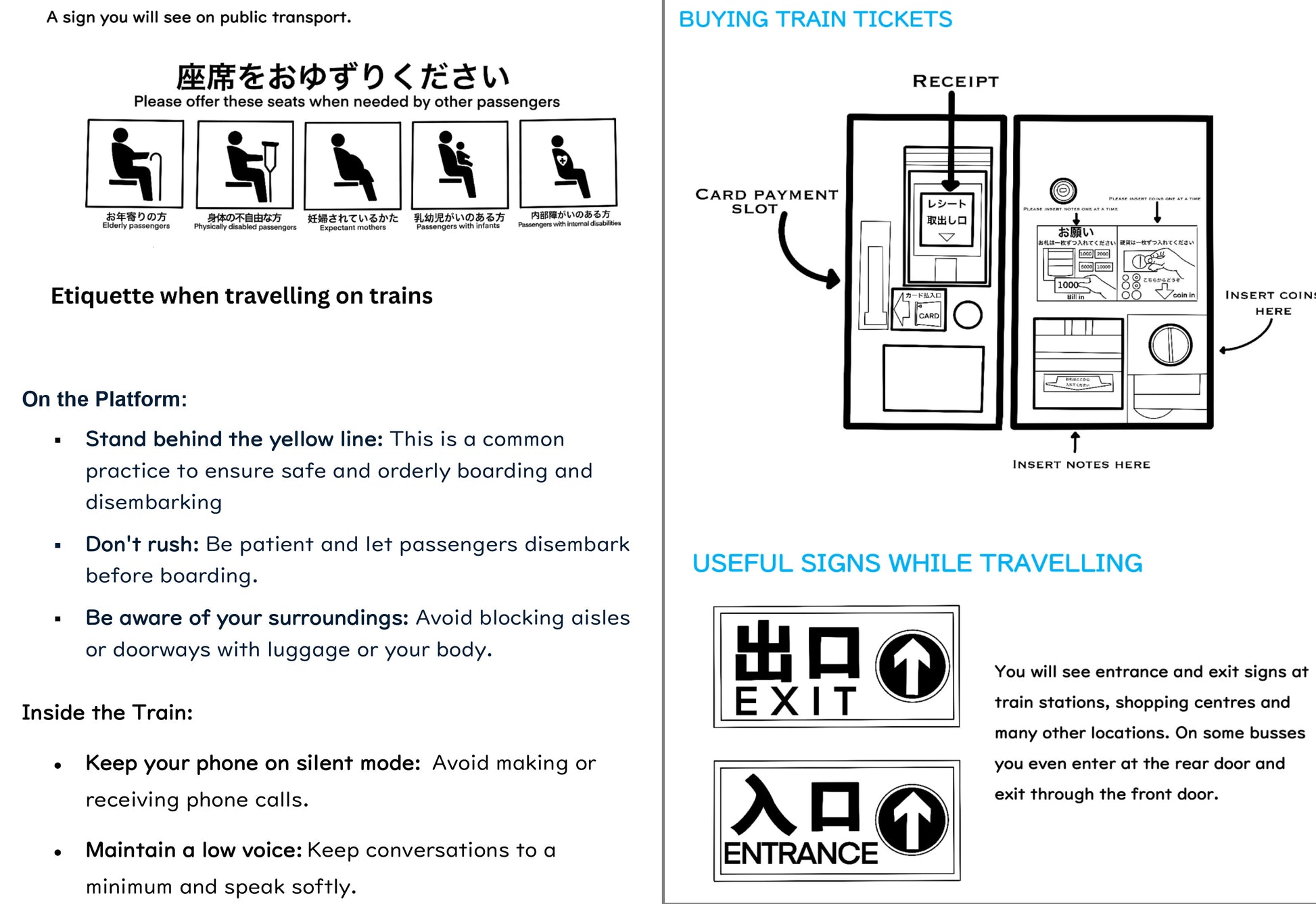 - Cultural guides (directions, transportation, recycling, Japanese style rooms, bathrooms/toilets, visiting temples and shrines, convenience stores, dining etiquette, currency, food, etc)